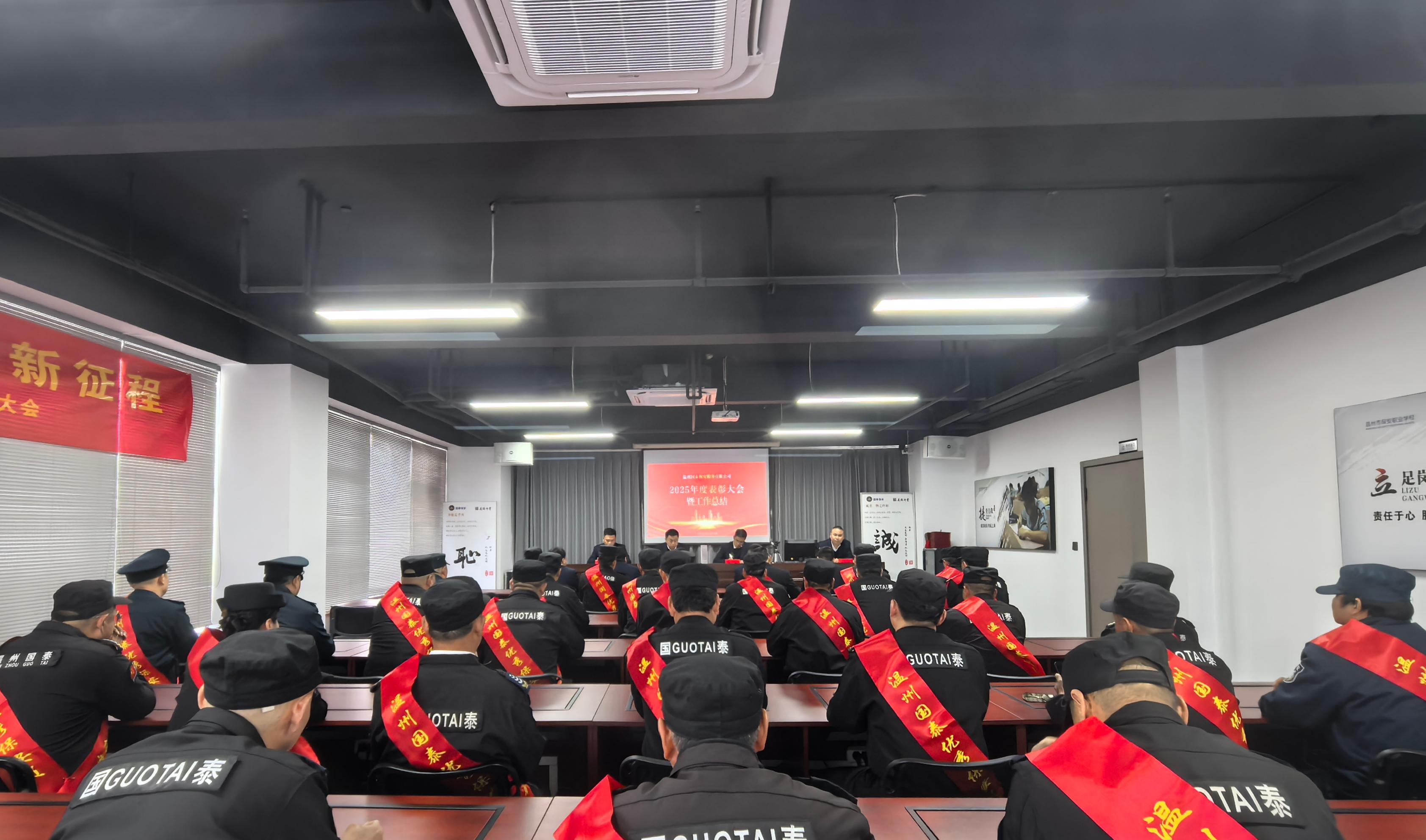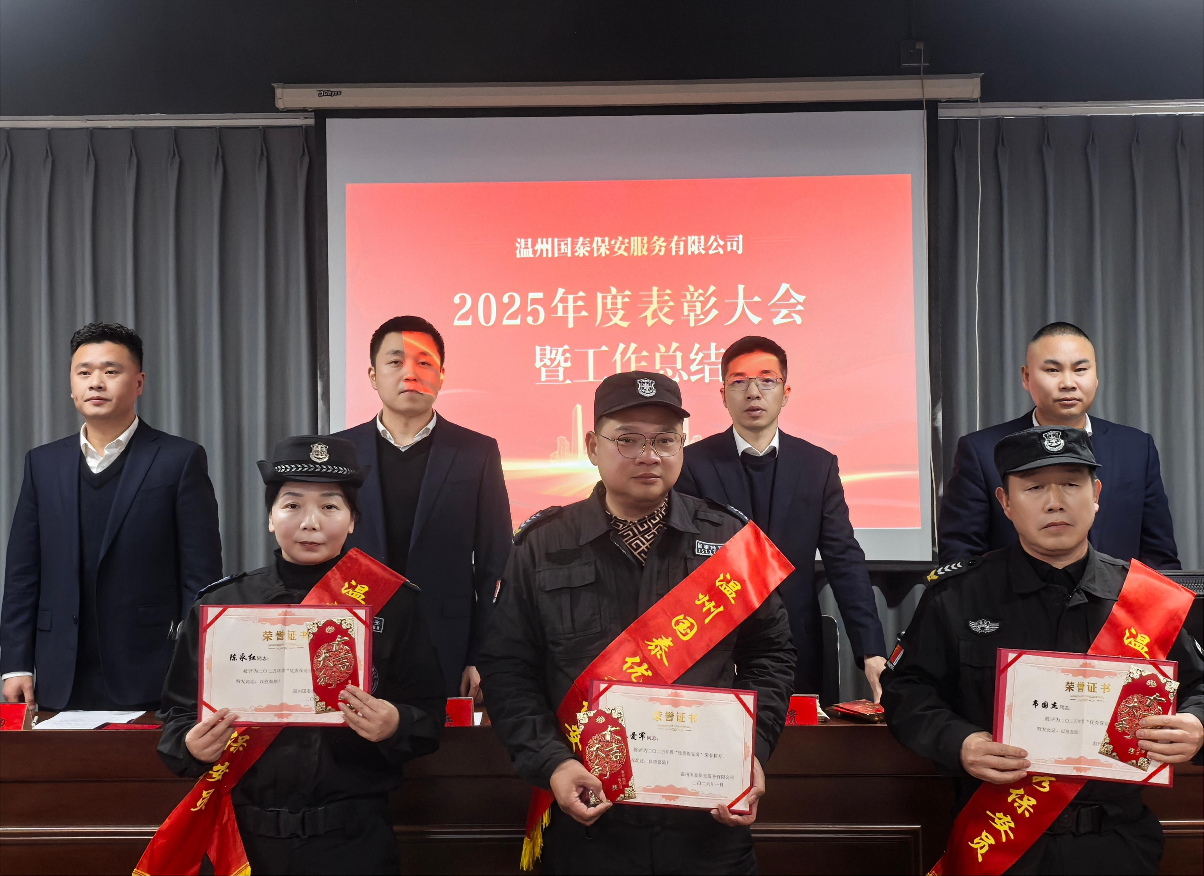 ? ? ? 大會由保安部副經(jīng)理屠德印主持。會上,保安部應(yīng)經(jīng)理首先作2025年度人防工作報告,系統(tǒng)總結(jié)全年安全保障成果,全年為180家客戶單位服務(wù),2900余名保安覆蓋多個領(lǐng)域,案例入選省保安協(xié)會創(chuàng)新案例,客戶滿意度超98%,并圍繞2026年重點任務(wù)提出規(guī)劃,強調(diào)以更高標準筑牢安全防線。隨后,公司副總經(jīng)理金露兵宣讀表彰決定,對先進駐點集體、優(yōu)秀骨干以及優(yōu)秀安保人員進行表彰并頒發(fā)獎品。獲獎代表們身披綬帶、手捧證書,現(xiàn)場掌聲如雷,充分彰顯出榜樣的力量。